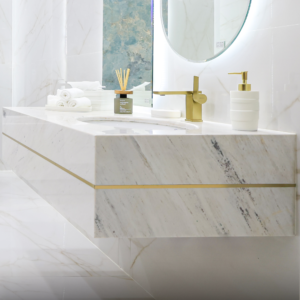 • Slab from La Marmoteca collection has a distinct modern personality and is distinguished by its Golden Carbon.