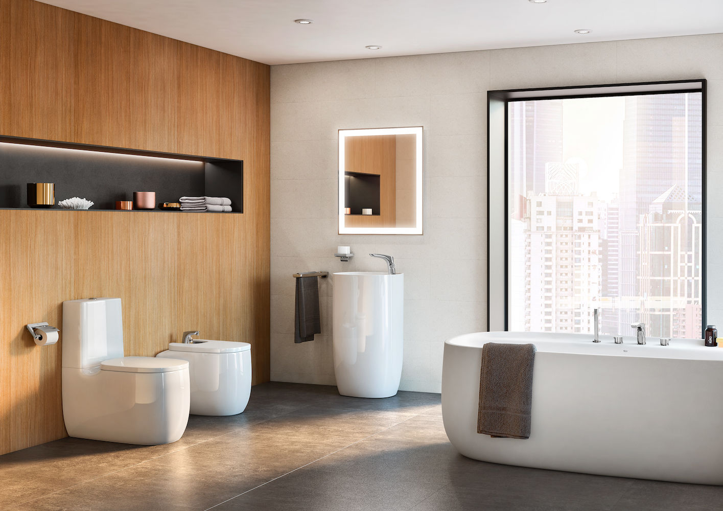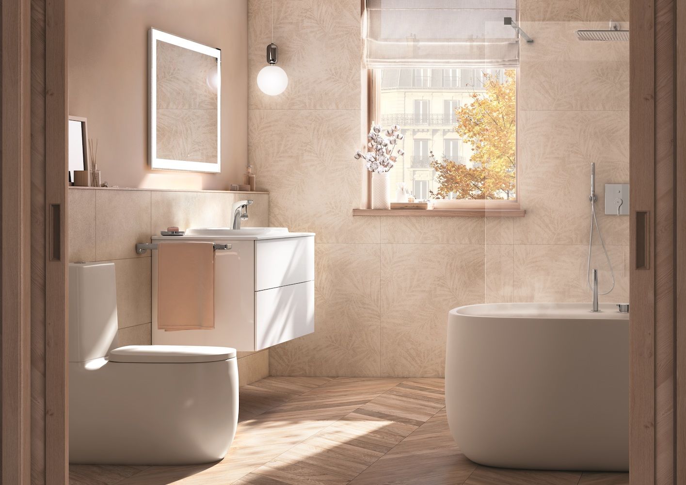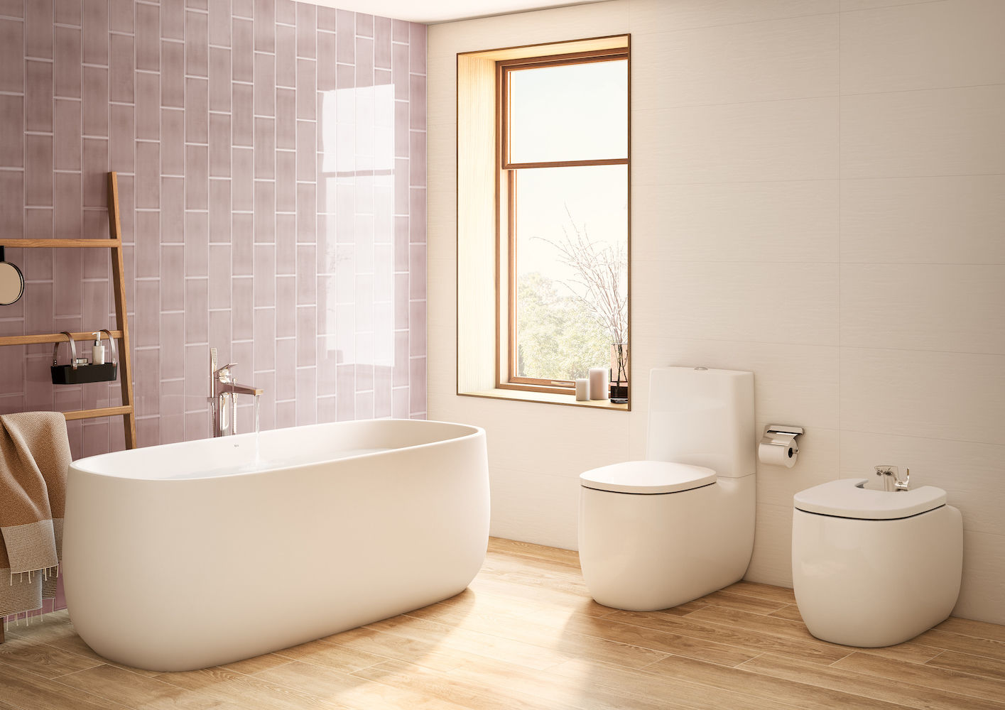 Beyond Back to wall vitreous china closed- couple rimless WC with dual outlet for easier cleaning and greater hygiene, with flash down flushing system and floor-standing installation type.
