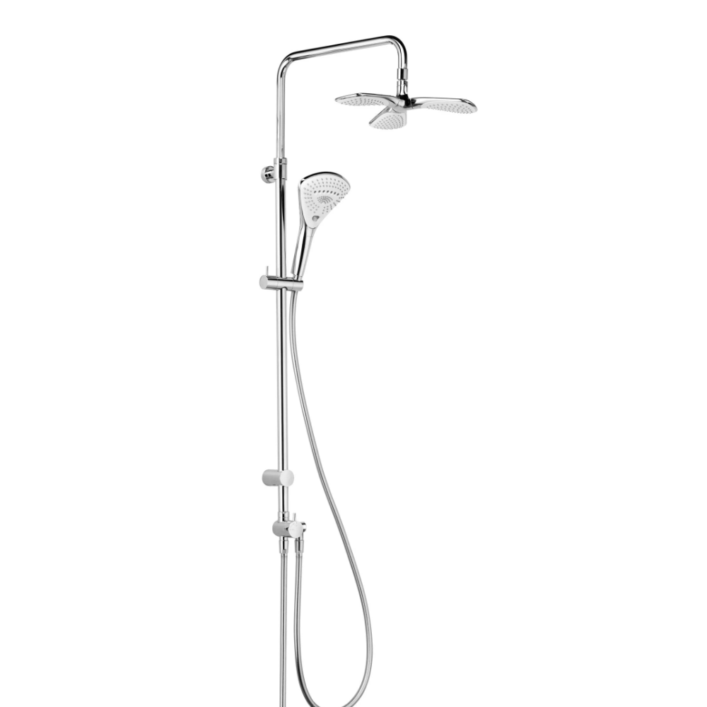 Kludi Fizz Dual Shower with horizontally and vertically adjustable tube with two-way ceramic diverter. With its modern design and swivelled shower arm, this Kludi shower system adds opulent flair to your bathroom.