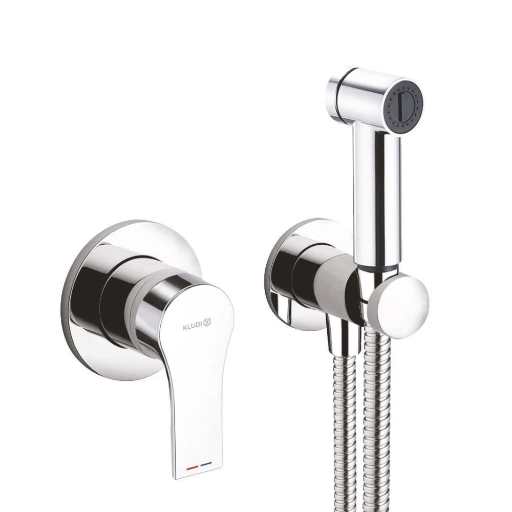 Kludi Zenta Hygiene Set with hygienic hand shower, a hose and a hand shower holder, designed for intimate hygiene over the toilet.