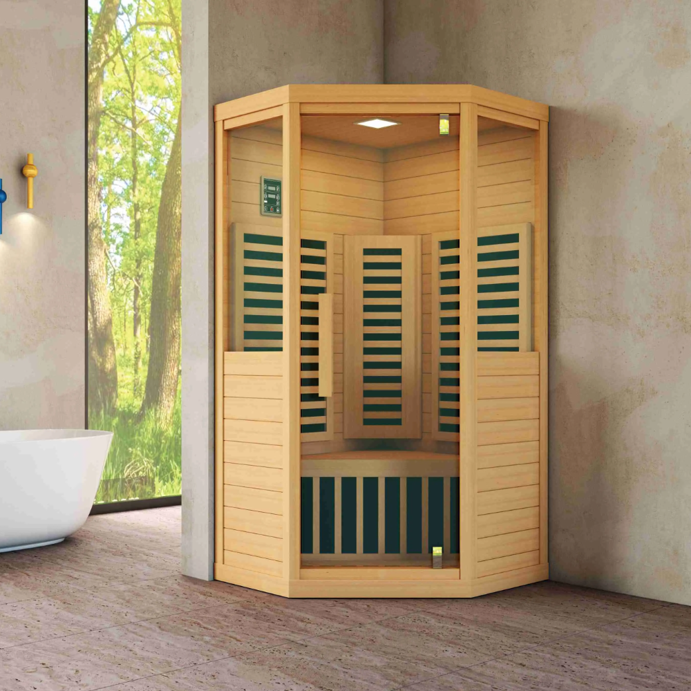 Elevate wellness with Orans’ Canadian Hemlock Infrared Sauna, with Intelligent controls, therapy options, Bluetooth music, and colorful lights for rejuvenation.