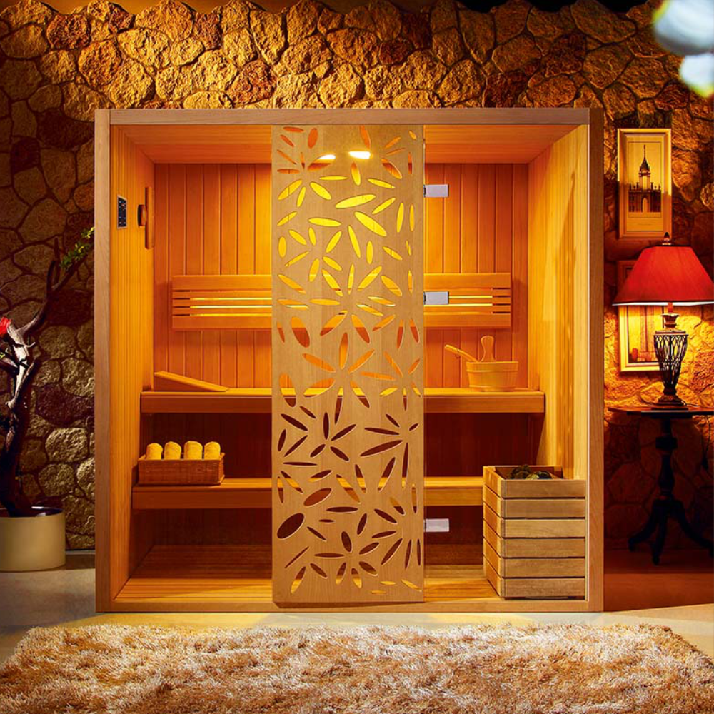 Orans Portable Home Sauna: Luxury in Canadian Hemlock, German Red Beech, and glass. Control your relaxation with ease via electronic and Bluetooth connectivity.