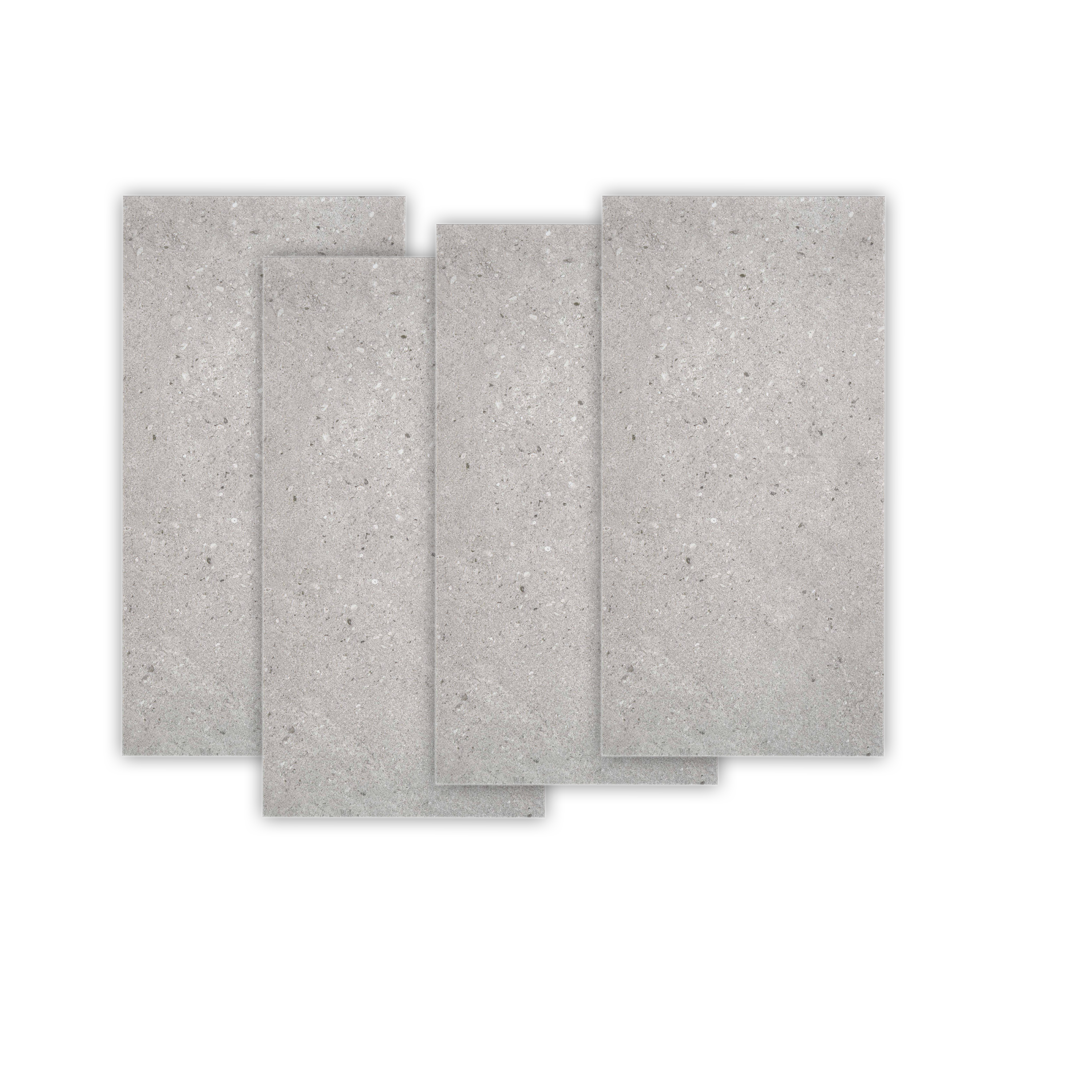 Roca Balance Gris: Inspired by authentic stones like limestone, porphyry, and sandstone, with small inlaid stones for a natural, authentic look.