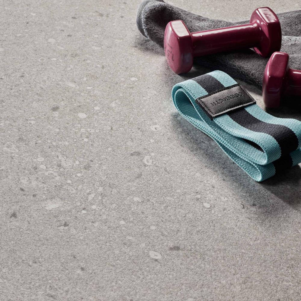 Roca Balance Gris: Inspired by authentic stones like limestone, porphyry, and sandstone, with small inlaid stones for a natural, authentic look.
