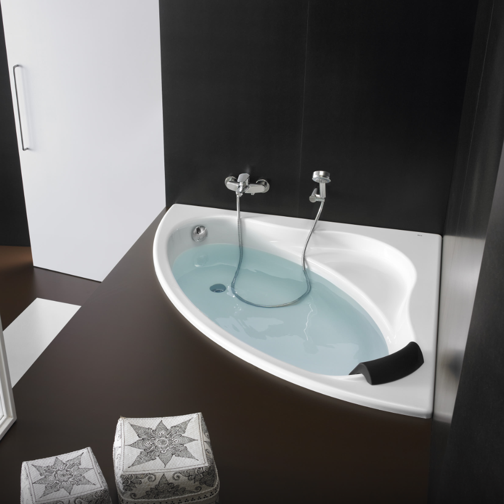 Roca Bali Symmetrical Corner Bathtub an angular bath of organic inspiration. Its curved and natural lines create a warm and pleasant environment.