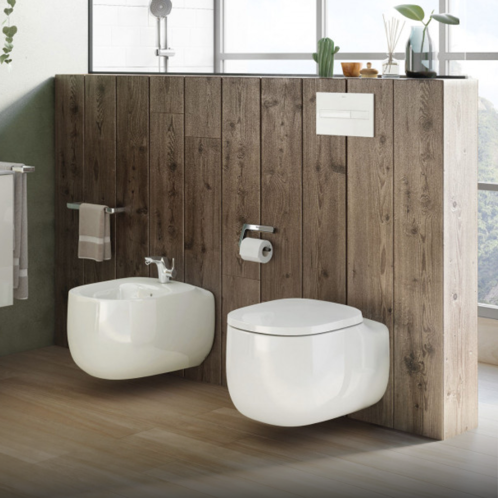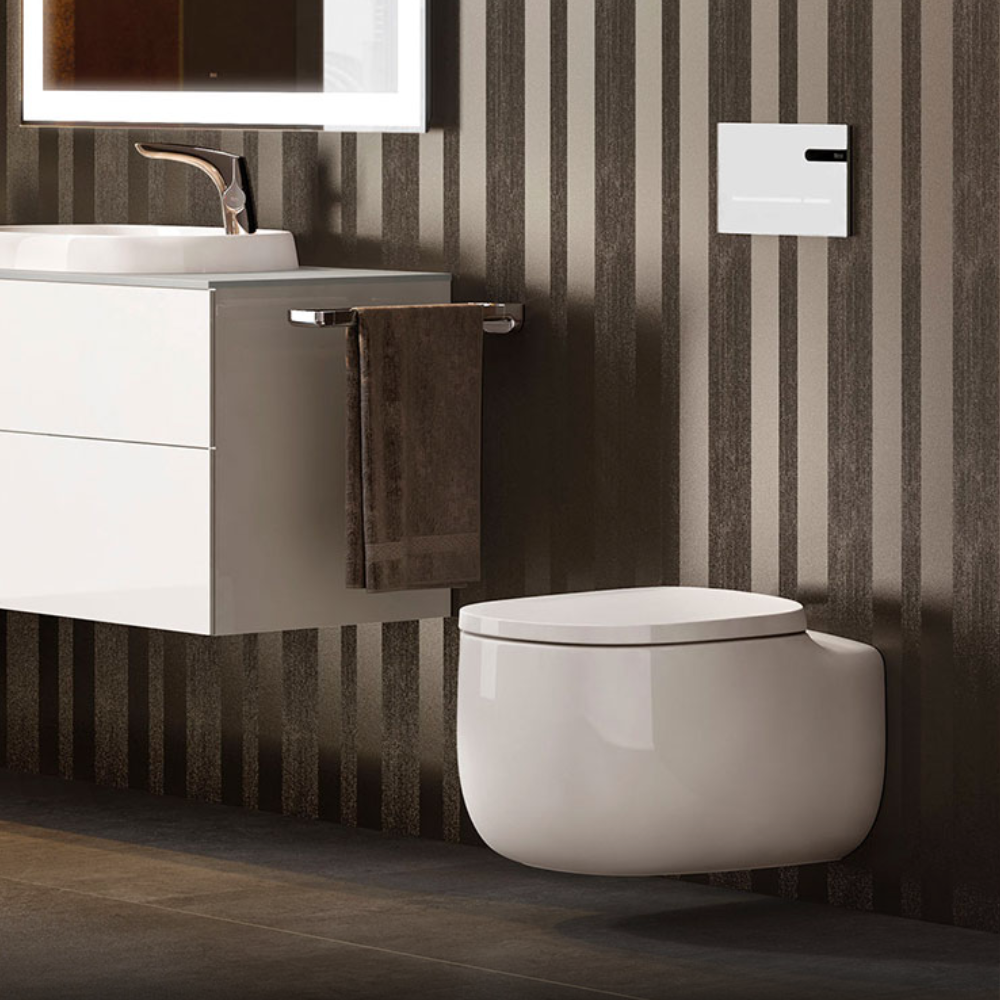 Roca-Beyond Wall-Hung Rimless WC, a rimless bowl design which makes easier to clean as there is no rim for dirt and germs to hide underneath, saving you spending time scrubbing your toilet!