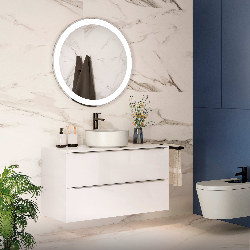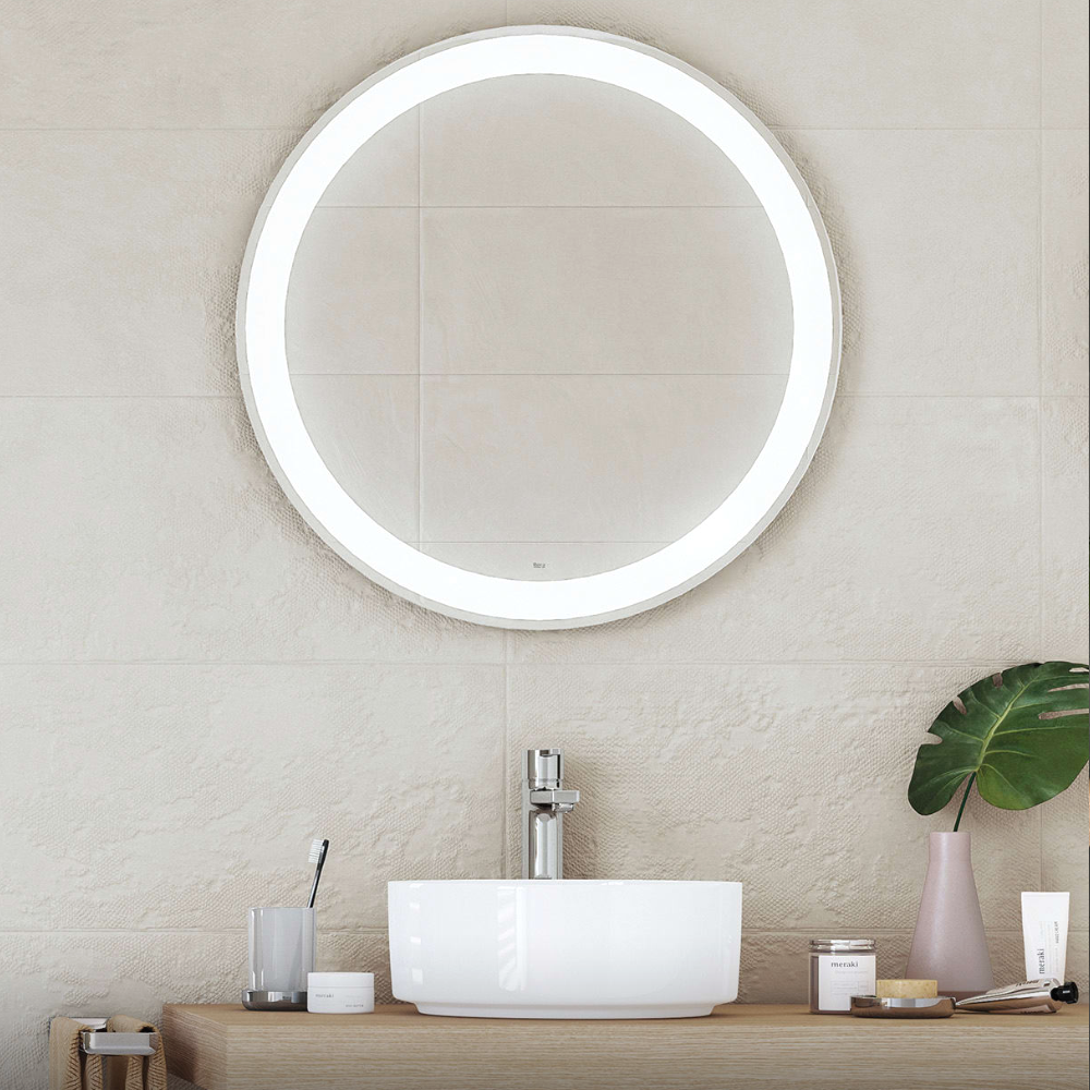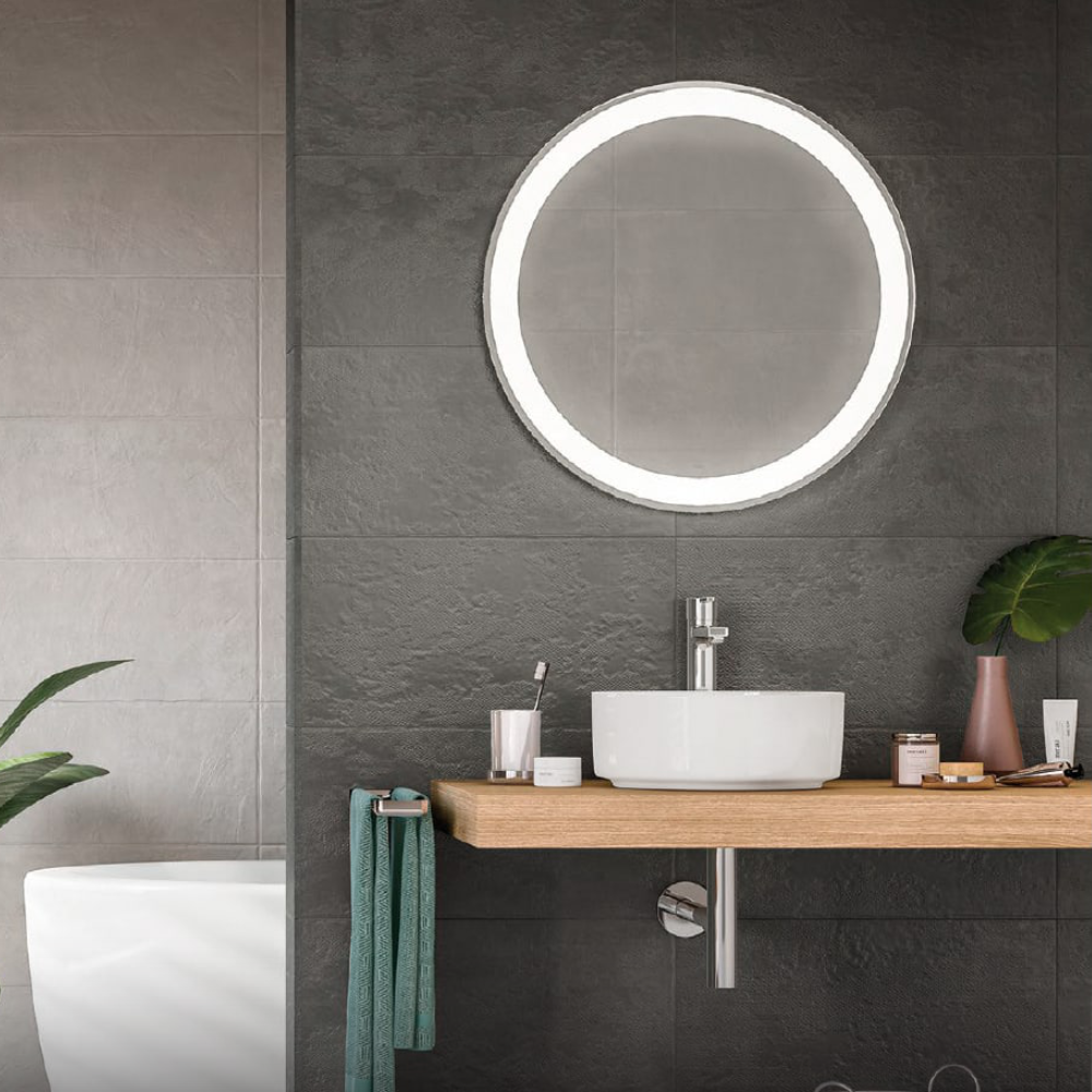 Roca Iridia Round Mirror LED Light a round mirror with perimetral LED lighting and demister device, A luxurious collection with integrated LED lights creating an illuminated ambiance.