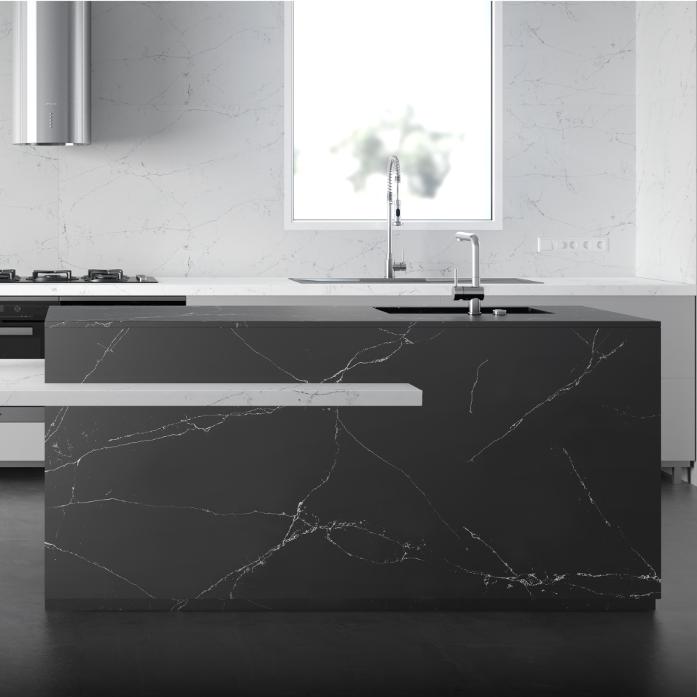 Features a true black base topped with lighter veining throughout, the sheer darkness of this worktop is guaranteed to appear bold and captivating in your room of choice, compatible with both kitchens and bathrooms due to its heat and water-resistant surface crafted using natural quartz bonded with premium pigments and resins.