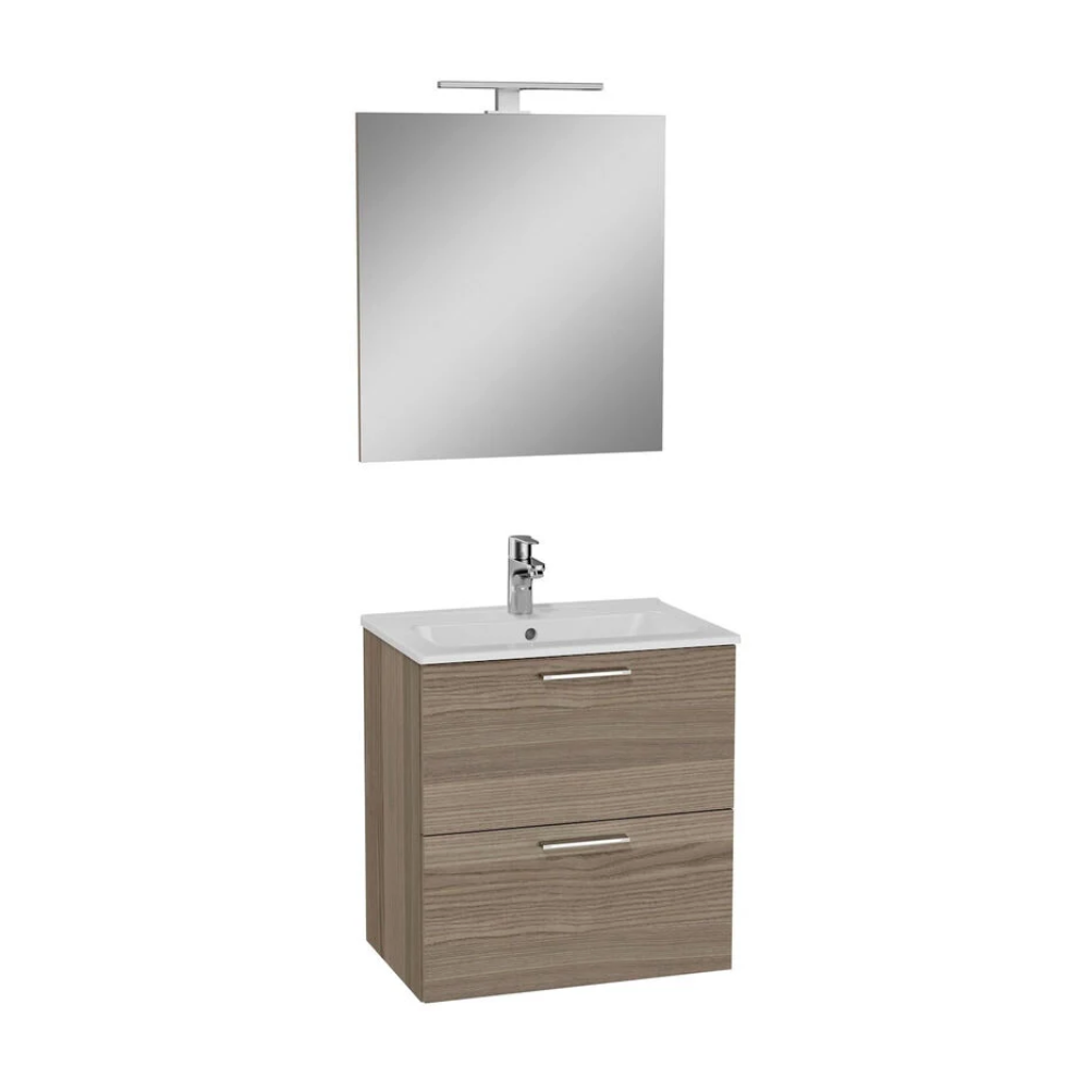 Vitra Mia Bathroom Furniture Set with modern and minimal design, with double drawer cabinet, basin and a mirror with LED light for diffused lighting throughout the bathroom.
