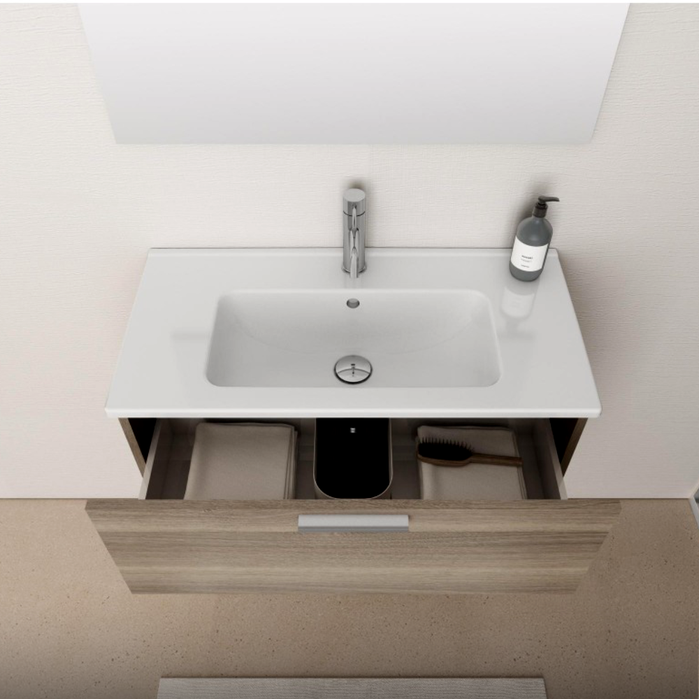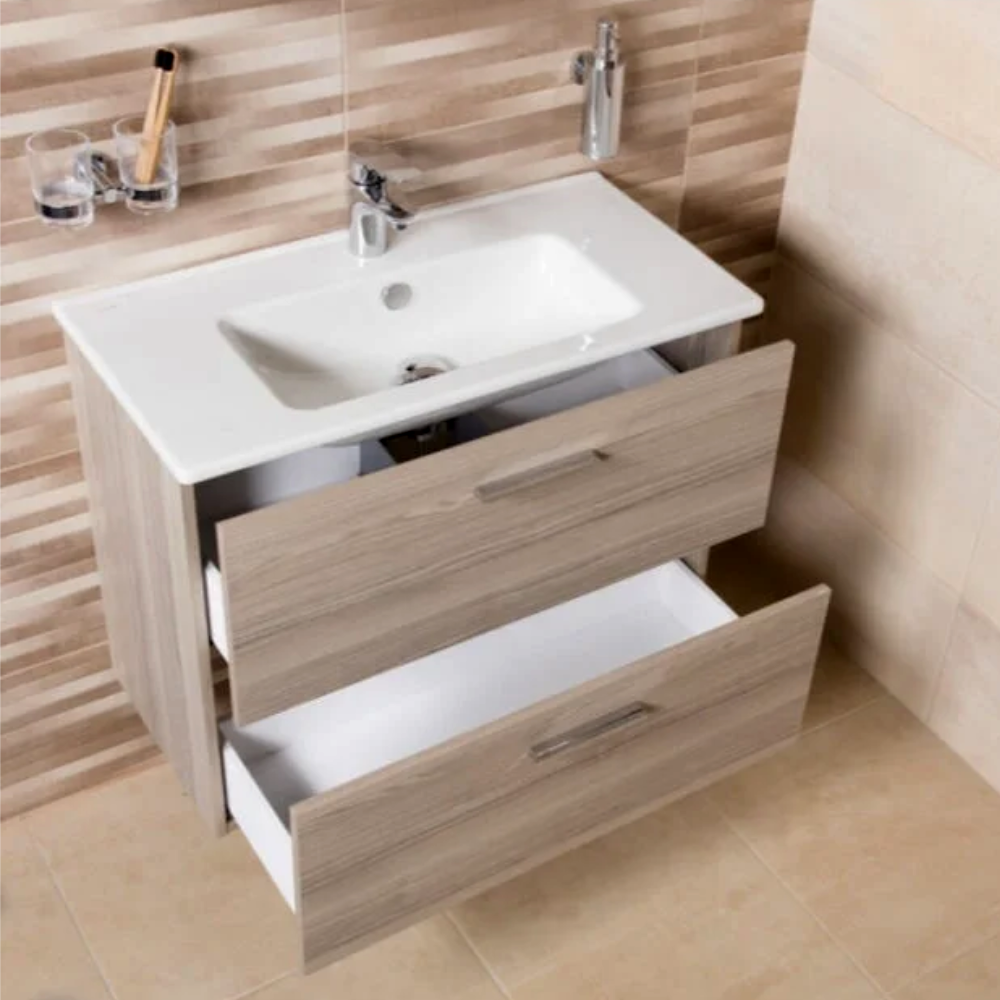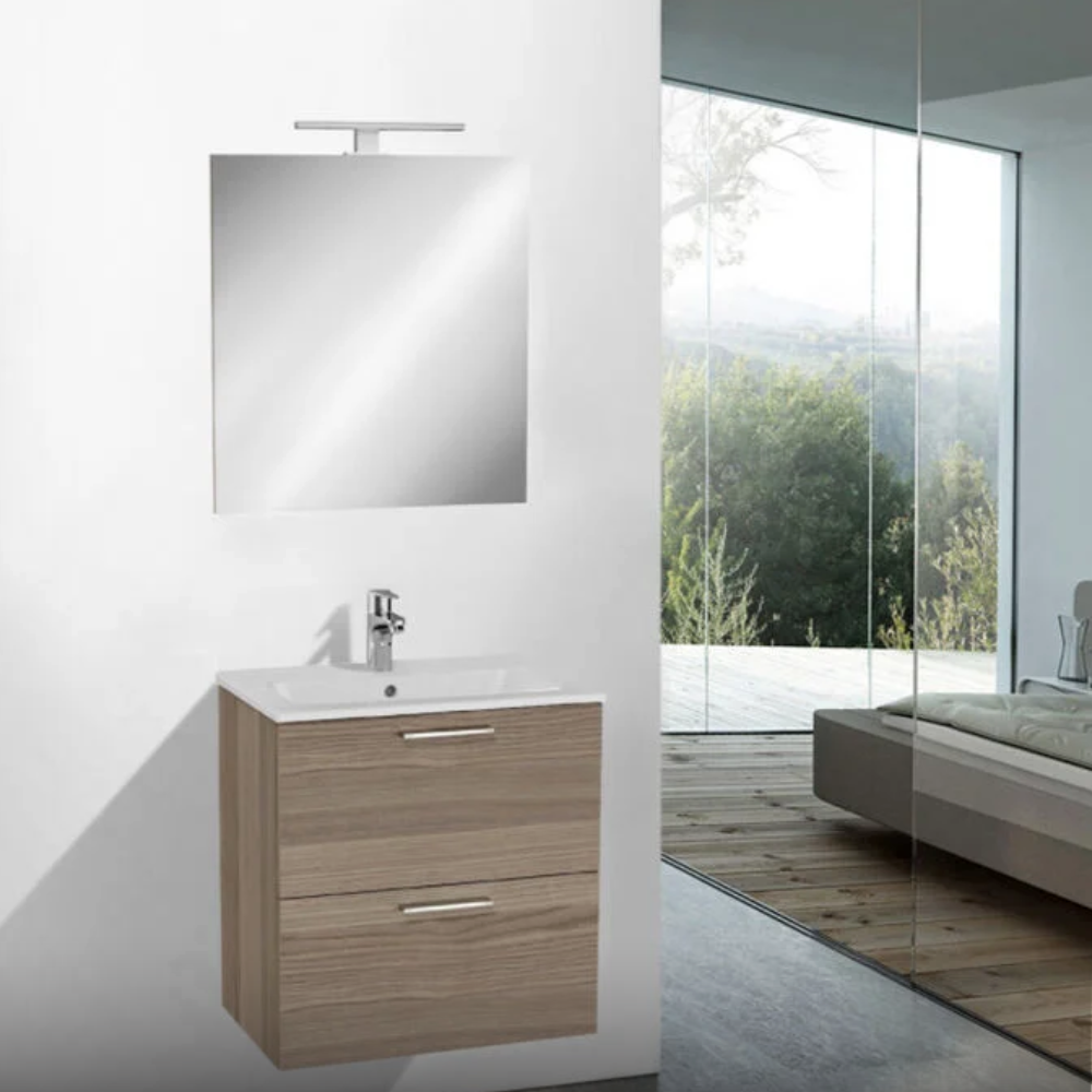 Vitra Mia Bathroom Furniture Set with modern and minimal design, with double drawer cabinet, basin and a mirror with LED light for diffused lighting throughout the bathroom.