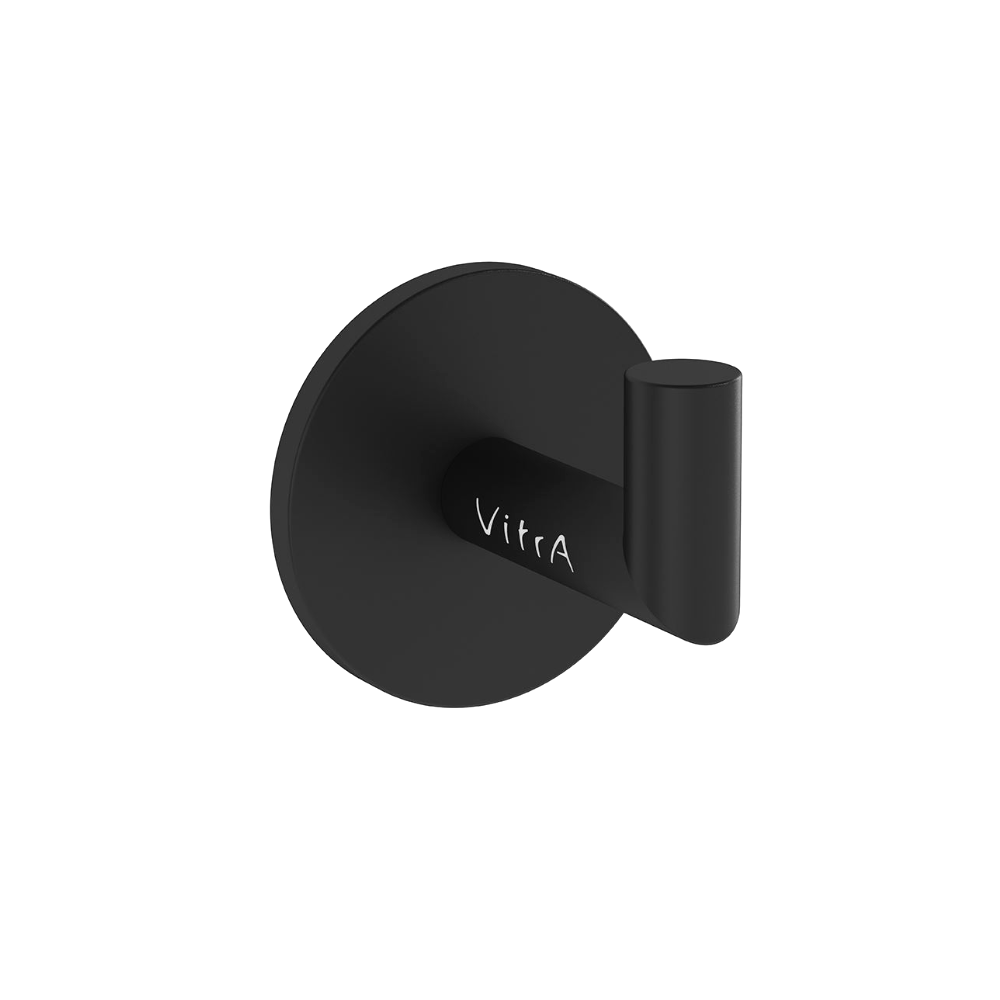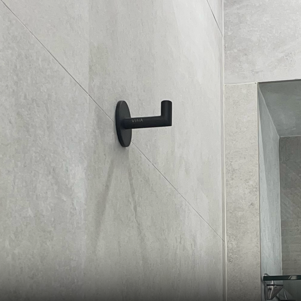 A Stunning matte black wall mounted robe hook from Vitra, that allows you to match all of the brassware in your bathroom in the same matte black finish.